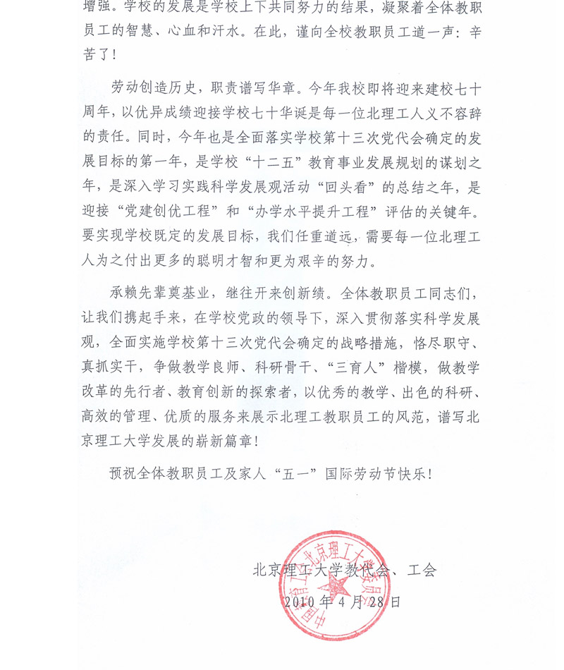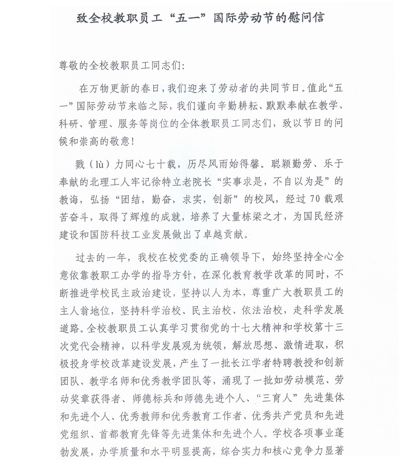 > 致全校教职员工“五一”国际劳动节的慰问信