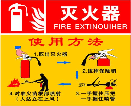 此外,要注意外出安全,出门不要携带酒精、汽油、摩丝等易燃易爆物品;进入宾馆、饭店或娱乐场所时,要留意安全出口及消防栓、灭火器的位置等。外出前做到“四查”,即查看气阀是否关严、电闸是否拉下、电源插头是否拔下、易燃物是否安全。此外,外出前一定要锁好门、关好窗。如果发生火情、火险,要保持镇静,要合理利用灭火器进行初期火灾的扑救,灭火器使用方式如下图: