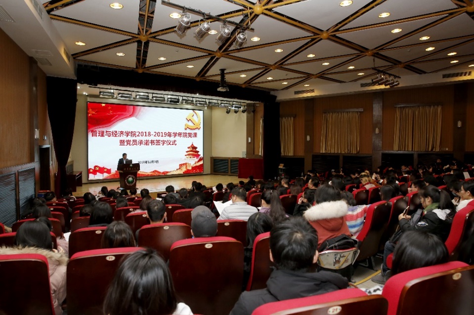 12月9日,管理与经济学院在七号楼报告厅举行专题党课暨党员承诺书签字仪式。学院党委书记王兆华及2018级全体研究生学生党员、预...